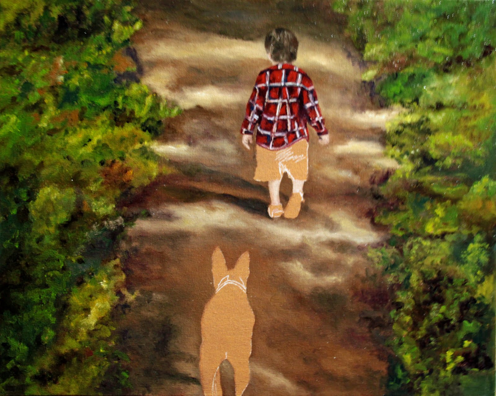 Some times I will see an image that touches me and I know I will love painting it... this is one of those paintings. I have a friend that shared pictures of her grandson with me and immediately I knew this was something special. There were two photo's of he and his little dog walking down a path... in one picture the dog was in perfect form and in the other the little boy's body posture was perfect.... soooo I took the best of both photo's and came up with this...